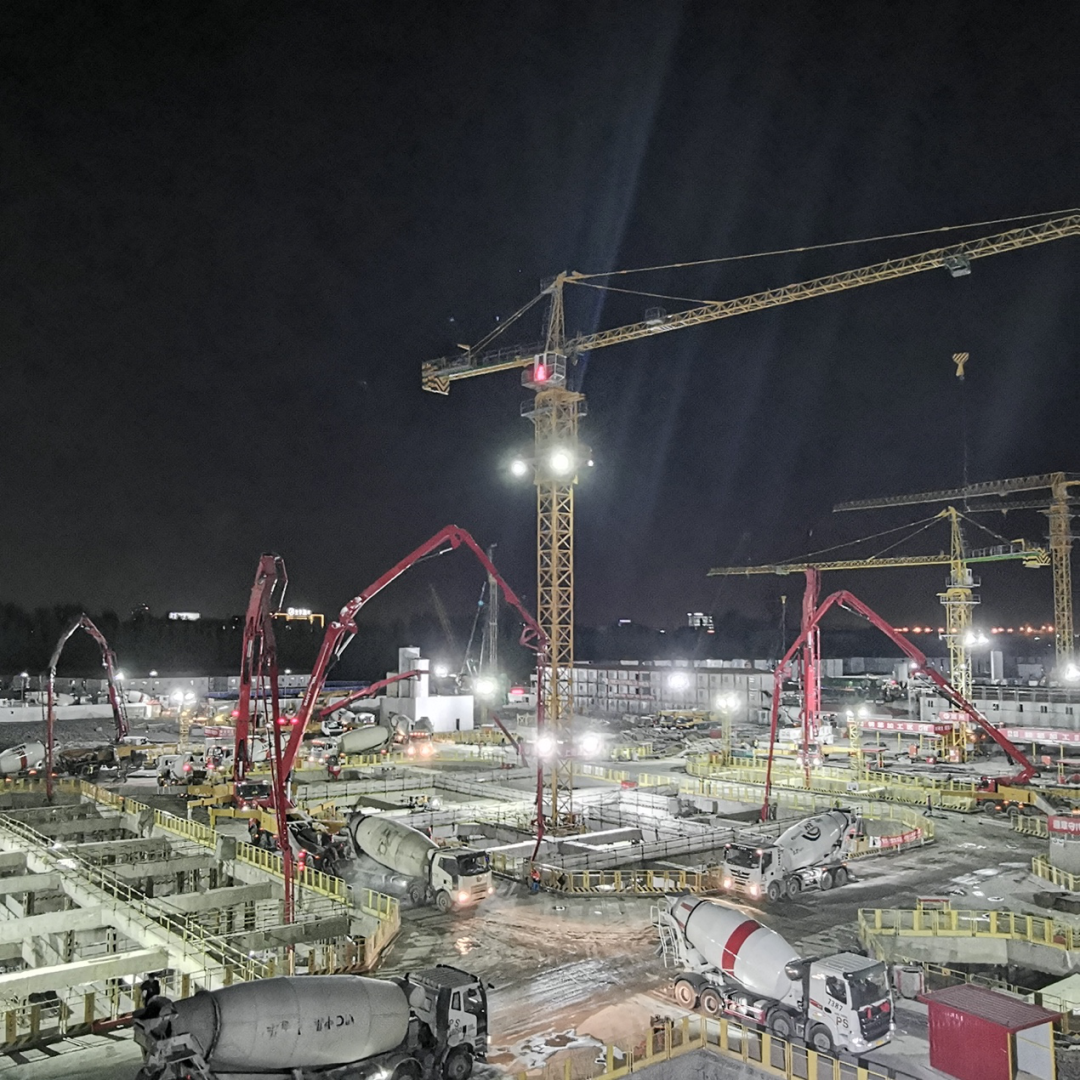 超高(gao)层楼宇施工(gong)难度大(da),而基础底板的(de)一(yi)次性连续浇筑,关係(xi)到(dao)大(da)楼的(de)基础,質(zhi)量要求非(fei)常高(gao)。周边同时有(yǒu)8箇(ge)地块在(zai)同步施工(gong),也(ye)加(jia)大(da)了(le)施工(gong)难度。2套三一(yi)搅拌站、6檯(tai)三一(yi)泵車(che)加(jia)2箇(ge)自卸溜槽、60多(duo)檯(tai)三一(yi)搅拌車(che)参与了(le)基础底板的(de)施工(gong)。55箇(ge)小(xiǎo)时,昼夜不停,三一(yi)設(shè)備(bei)完美施工(gong),赢得客戶(hu)赞赏。
